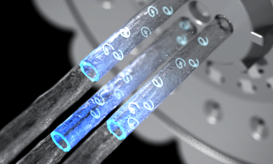 中心部が空洞になった直進性の高い3つの吐水。空洞部で気流を巻き込むことによってウルトラファインバブルを生成します。ウルトラファインバブルを含み、空洞によってあたりは柔らかでも確かな洗浄力を発揮します。