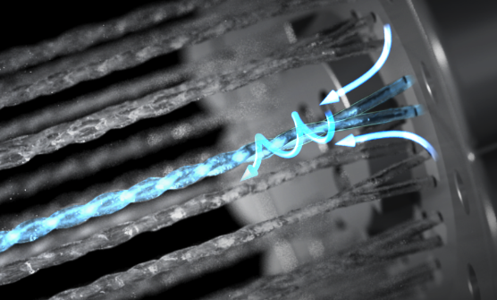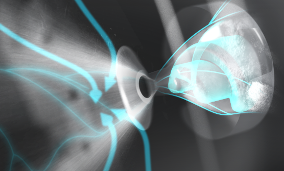 2本の水流を吐出後に衝突させることでスクリュー状のねじれた水流が発生します。ねじれ流はウルトラファインバブルを発生させながら吐水され、見た目は通常のシャワー水流に見えても、毛穴に衝突する際に確かな洗浄力を発揮します。