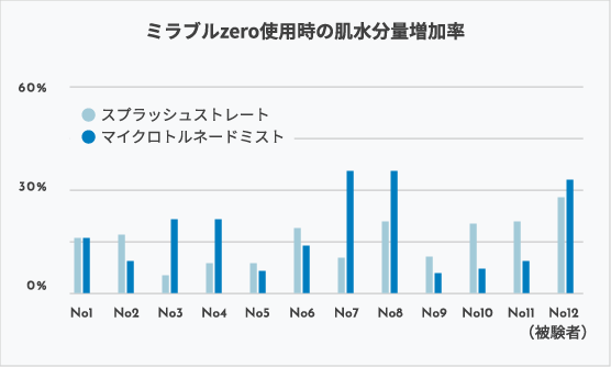 2つの水流を使用した後の肌の水分量を測定。ミラブルzero使用後は使用前と比較して肌の水分量がアップ。お湯が肌に浸透して潤うことがわかりました。
