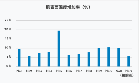 スプラッシュストレート水流を使用した後の肌の表面温度を測定。ミラブルzeroを使用前後での肌表面温度を比較したところ、平均9%上昇することがわかりました。