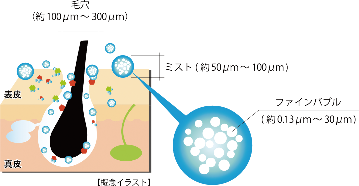 ※ウルトラファインバブルとは、1μm未満の泡の事(ISOで定められた国際標準規格)で、マイクロバブルよりさらに小さく、非常にすぐれた洗浄力を持っています。