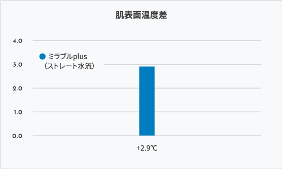 一般的なシャワーヘッドとミラブルplusを使用した後の肌の表面温度を測定。ミラブルplusでは、一般的なシャワーヘッドを使用した場合より平均3.6倍の温度上昇となり、シャワーだけでも温まって湯冷めしにくいことがわかりました。