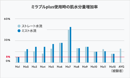 ストレート水流、ミスト水流ともに、20秒間あてた後に拭上げた直後の肌水分量を測定。最小でも8%の肌水分量アップという結果。